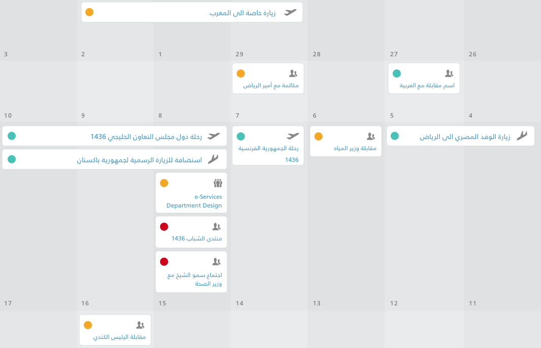 The scheduling manager also provides the users with the ability to view the schedule of the events on Daily, Weekly and Monthly views, to assist the users in organizing the schedule of the key persons. In addition to that, the system provides the users with the ability to view the scheduled trips on the calendar, to facilitate their related work.